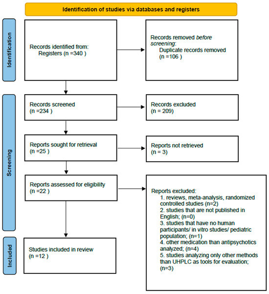 Exclusion criteria were: (i) reviews and meta-analyses; (ii) randomized controlled trials; (iii) studies not published in English; (iv) studies without human participants (in vitro experiments) or those involving pediatric populations; (v) studies analyzing medications other than antipsychotics; and (vi) studies evaluating only non-UHPLC methods or using non-biological samples.