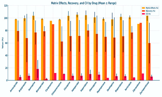 Analytical performance varied across the evaluated antipsychotic drugs, as seen in Figure 2. Matrix effects were generally controlled, with most drugs showing mean values near 100%. Matrix effects express ion suppression or enhancement relative to a pure standard solution. Values below 100% indicate signal suppression (e.g., 95% corresponds to a 5% loss in signal), whereas values above 100% indicate signal enhancement due to matrix-related interference. Exceptions included Asenapine and Iloperidone, which displayed broader variability. Bars show the mean values of matrix effects, recovery and CV per drug, with error bars representing the reported range across studies. No inferential statistics were applied, as the purpose was descriptive comparison of analytical performance across compounds.