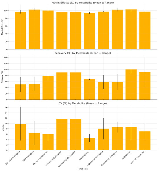 With growing interest in monitoring antipsychotic metabolites for treatment adherence, several studies evaluated their analytical performance using UHPLC, with detailed data presented in Figure 3. For each metabolite, mean values of matrix effects, recovery and CV were calculated across studies, with ranges shown as error bars.