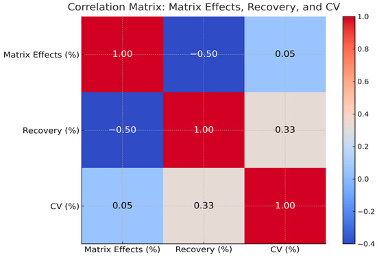 Correlation analysis assessed the relationships between matrix effects, recovery, and precision across included UHPLC studies (Figure 4). The strength and direction of these associations were evaluated using Pearson’s correlation coefficient (r), where values closer to ±1 indicate stronger linear relationships. A moderate inverse correlation was found between matrix effects and recovery (r = −0.50). Matrix effects and CV% showed minimal correlation (r = 0.05). A weak positive correlation was observed between recovery and CV% (r = 0.33).