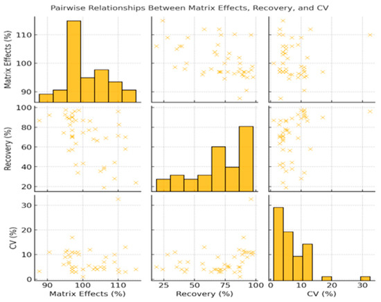 Figure 5 presents a pairwise scatterplot of these parameters. Matrix effects ranged from 95% to 105%. Recovery ranged from 20% to 100%, with most values between 75 and 95%. CV% values were primarily below 10%, with a few above 20%.
