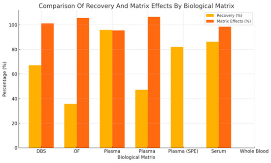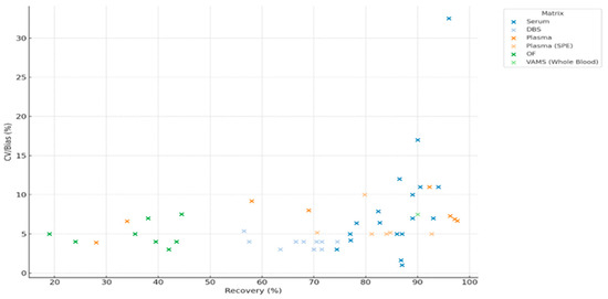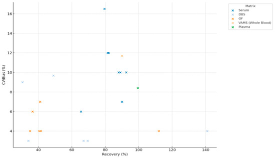 Analytical Performance Parameters (Matrix Effects, Recovery and CV) for UHPLC Quantification of Antipsychotic Drugs. (CV—Coefficient of Variation, ME—Matrix Effects, REC—Recovery). Plasma and serum provide the most consistent performance, confirming their role as preferred matrices for clinical TDM.