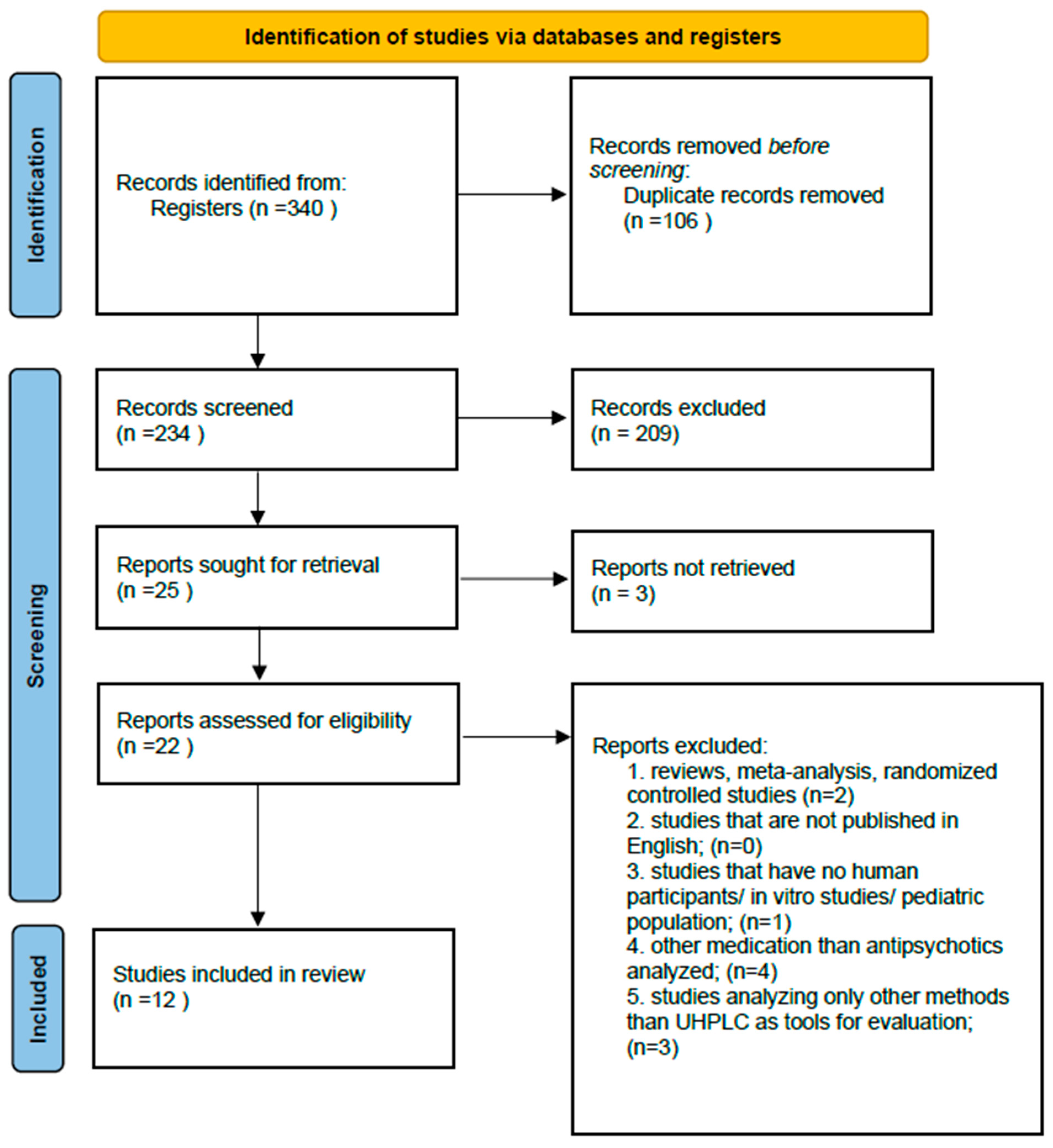 Băcilă, C.-I.; Macavei, B.-M.; Cornea, M.; Vintilă, B.I.; Lomnășan, A.; Anghel, C.E.; Grama, A.M.; Dobre, C.E.; Ichim, C.M.; Cioca, G. UHPLC-MS/MS for Antipsychotic Drug Monitoring: A Systematic Review of Clinical and Analytical Performance. J. Clin. Med. 2025, 14, 7544. https://doi.org/10.3390/jcm14217544