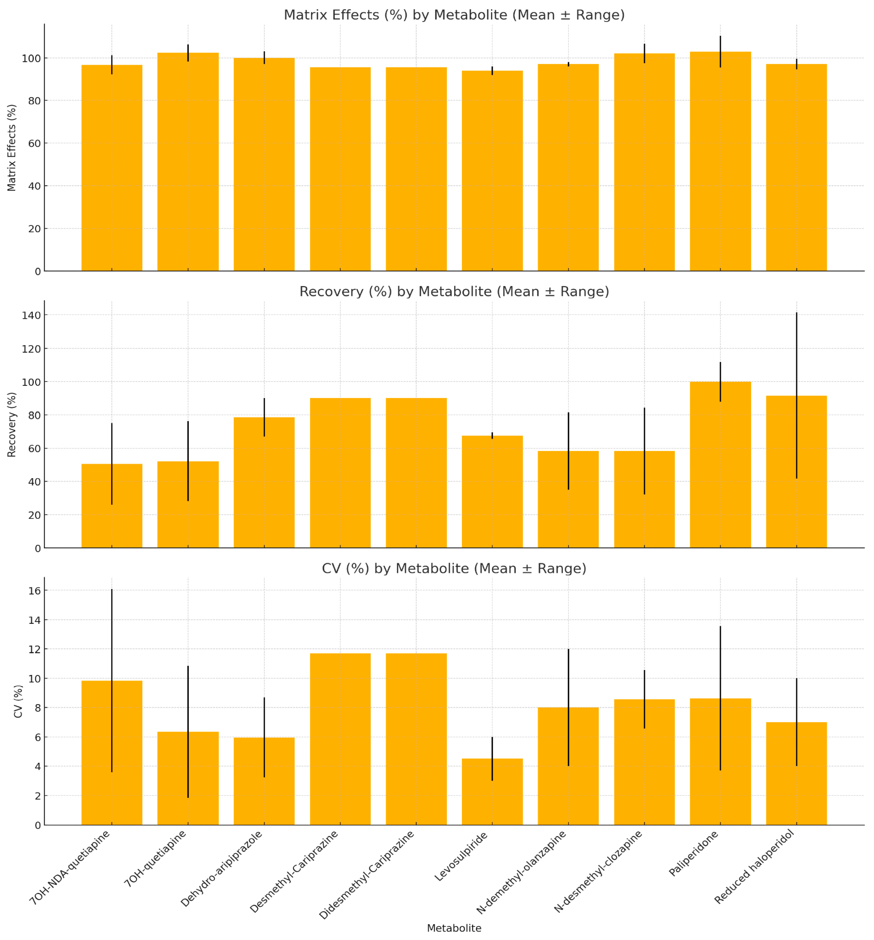 3.4.3. Analytical Method Performance Across Antipsychotic Metabolites