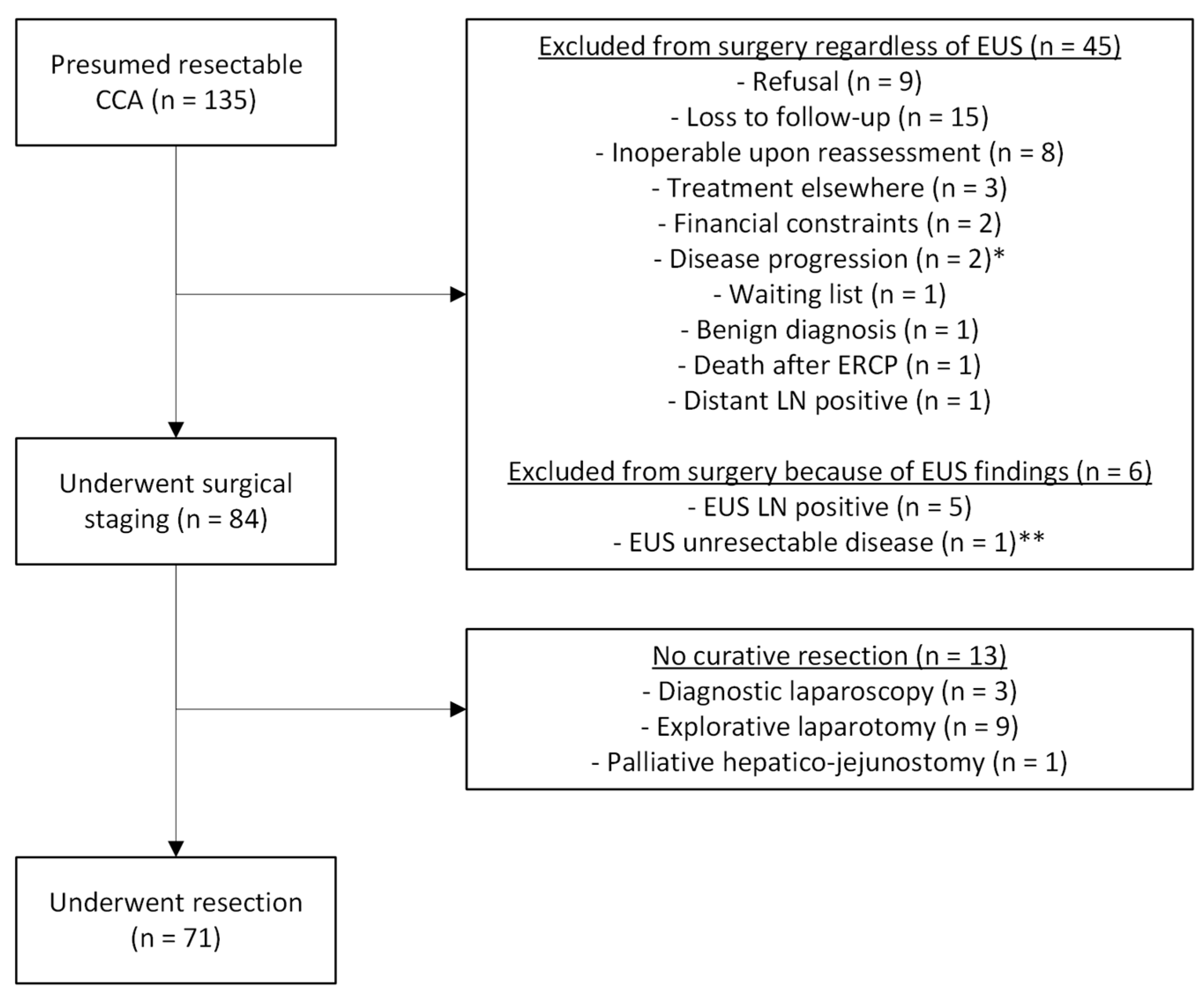 - de Jong, D.M.; van de Vondervoort, S.; Dwarkasing, R.S.; Doukas, M.; Voermans, R.P.; Verdonk, R.C.; Polak, W.G.; de Jonge, J.; Groot Koerkamp, B.; Bruno, M.J.; et al. Endoscopic ultrasound in patients with resectable perihilar cholangiocarcinoma: Impact on clinical decision-making. Endosc. Int. Open 2023, 11, E162–E168. [Google Scholar] [CrossRef]