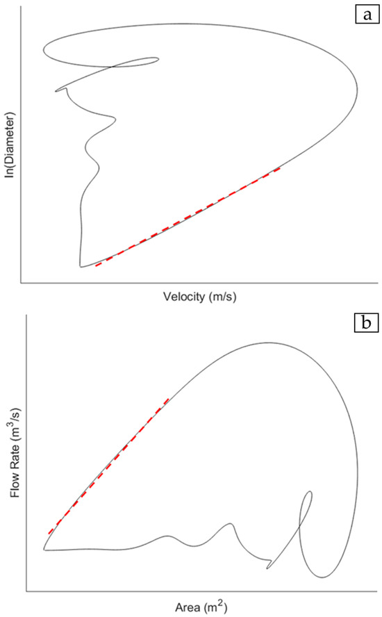 (a) An example of the lnDiameter-velocity (lnDU) loop depicting the linear portion of a curve (---) used to derive PWV via Equation (1) [21]. (b) An example of the flow-area (QA) loop depicting the PWV as being directly determined from the gradient of the loop at the linear portion of the loop (---) [19].