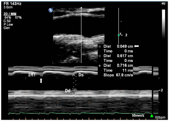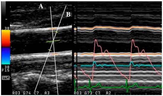 In area or diameter measurement, sound waves emitted by the transducer are partially reflected and transmitted at tissue boundaries with different acoustic impedances in the beam path, which causes differences in the echo return time and facilitates detection of different tissues at different depths [38]. There are three main imaging modes available on ultrasound machines, namely Amplitude (A-mode), Brightness (B-mode), and Motion (M-mode). A-mode ultrasound provides a one-dimensional scan line that displays the strength of the echoes as vertical peaks on a graph. While some studies have explored the use of A-mode ultrasound in simple system configurations to measure diameter [107,108,109], its use remains relatively under-represented in the literature relating to diameter and area acquisition. Hence, only B-mode and M-mode (Figure 2) ultrasound will be discussed. The functioning principles and use of each modality in measurement are summarised in Table 1.