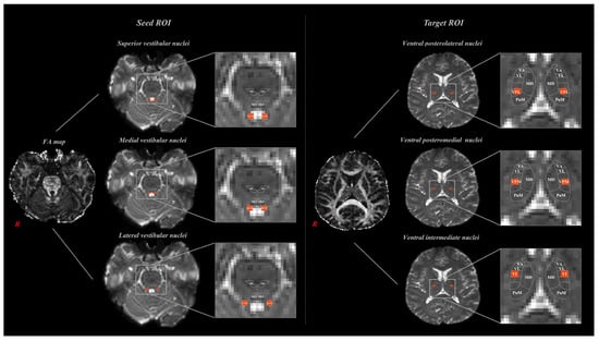 VTTs were determined by selecting fibers with nine tracts through three seed regions of interest (ROI), and three target ROIs. The seed ROIs of the superior vestibular nuclei (SVN), medial vestibular nuclei (MVN), and lateral vestibular nuclei (LVN) were located in the medulla and pons of the brainstem [3]. The seed ROIs included the superior vestibular nuclei (SVN), medial vestibular nuclei (MVN), and lateral vestibular nuclei (LVN) of the medulla and pons of the brainstem [3]. The target ROIs, which included the ventrobasal complex, ventral posterolateral nucleus (VPL), ventral posteromedial nucleus (VPM), and ventral intermediate nucleus (VI), are located caudally in the thalamus (Figure 1) [15]. A total of 5000 samples were generated from a seed voxel, and the results were visualized at a minimum of one streamline for each voxel. Based on previous anatomical and neuroimaging studies [3,15], each region of interest (ROI) was placed at the most reliable and reproducible anatomical locations for the vestibular and thalamic nuclei. These prior works have consistently defined the spatial boundaries and relative coordinates of the superior, medial, and lateral vestibular nuclei as well as the VPL, VPM, and VI thalamic nuclei, providing robust anatomical validation for our ROI positioning. Tractography was performed separately for each hemisphere, and reconstruction rates were averaged across sides to provide representative values.