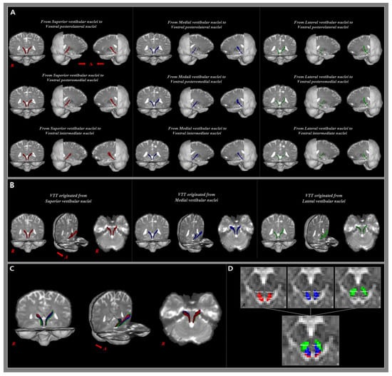 (A) The 9 analyzed vestibulothalamic tracts (VTT) are shown in the coronal plane and both sides of the sagittal plane. Color coding: Red—SuVN projections, Blue—MVN projections, Green—LVN projections. (B) Each of the 3 VTTs originating from the same seed ROI are shown combined. (C) A total of 9 VTTs are shown to be combined in the coronal plane and both sides of the sagittal plane. (D) The areas passing through the tectum and tegmentum at the mid-brain level are represented with the VTTs originating from the same seed ROI and 9 total VTTs, respectively.