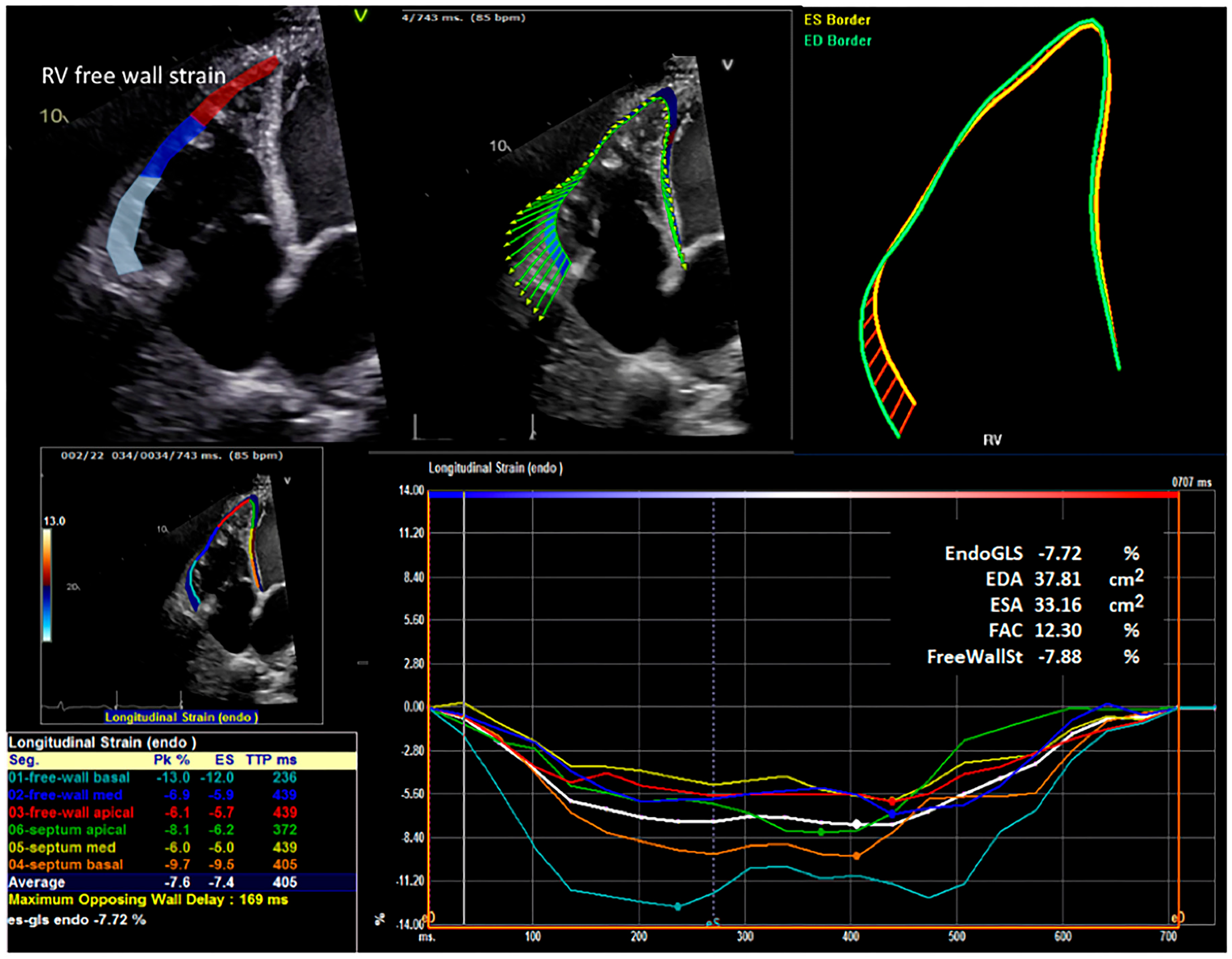 | Right ventricular free wall strain (%) | −8.0 | (−10.2, −5.1) | −6.0 | (−8.6, −4.2) | 0.07 |