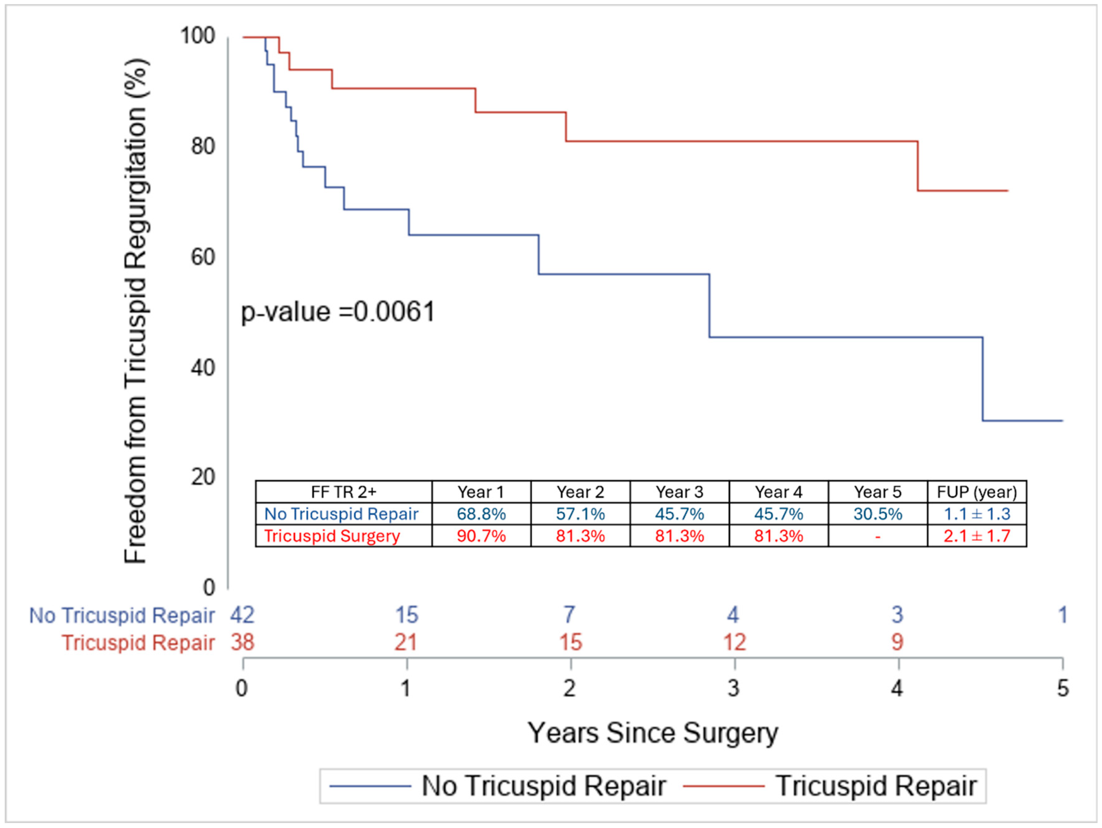 | Variable | No Tricuspid Valve Repair (N = 56) | Tricuspid Valve Repair (N = 44) | p-Value | ||