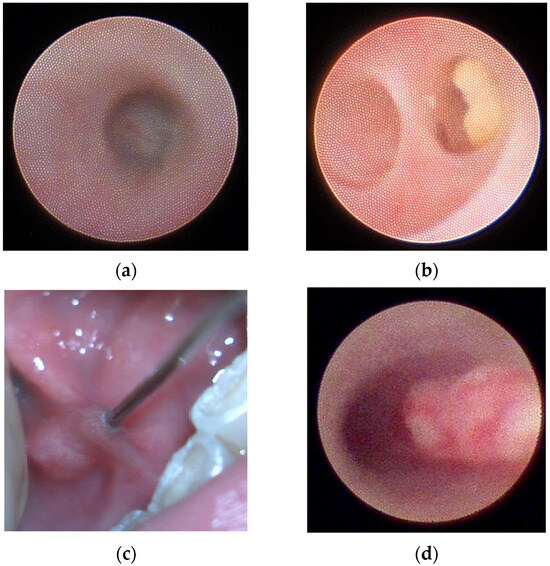 The procedure associated with sialendoscopy was selected based on the obstructive pathology and the feasibility of extraction, including purely endoscopic approaches or combined endobuccal or transfacial approaches, in accordance with previous algorithms [15]. Representative intraoperative sialendoscopic findings are shown in Figure 1.