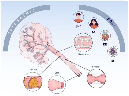 Conceptual map of the obstructive factors of chronic obstructive sialadenitis (COS) whether idiopathic or associated with potentially obstructive entities (POEs). LPD: lack of papilla distensibility; JRP: juvenile recurrent parotitis; RIS: radioiodine-induced sialadenitis; SS: Sjögren’s syndrome; and ES: eosinophilic sialodochitis.