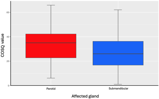Among the significantly influential factors was sex, with women reflecting higher COSQ values (average of 5.56 points higher) (p < 0.005). The duration of symptoms had a proportional influence on COSQ values, with longer symptom durations corresponding to higher COSQ scores (p = 0.01297). Additionally, quality of life was found to be significantly more affected in the parotid gland (p < 0.005) (Figure 3).