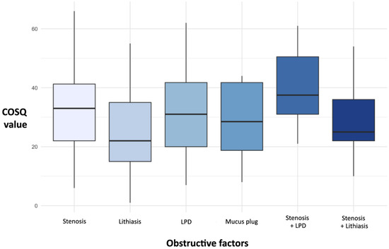 Box and whisker plot of COSQ values by obstructive causes (>1% of the sample).