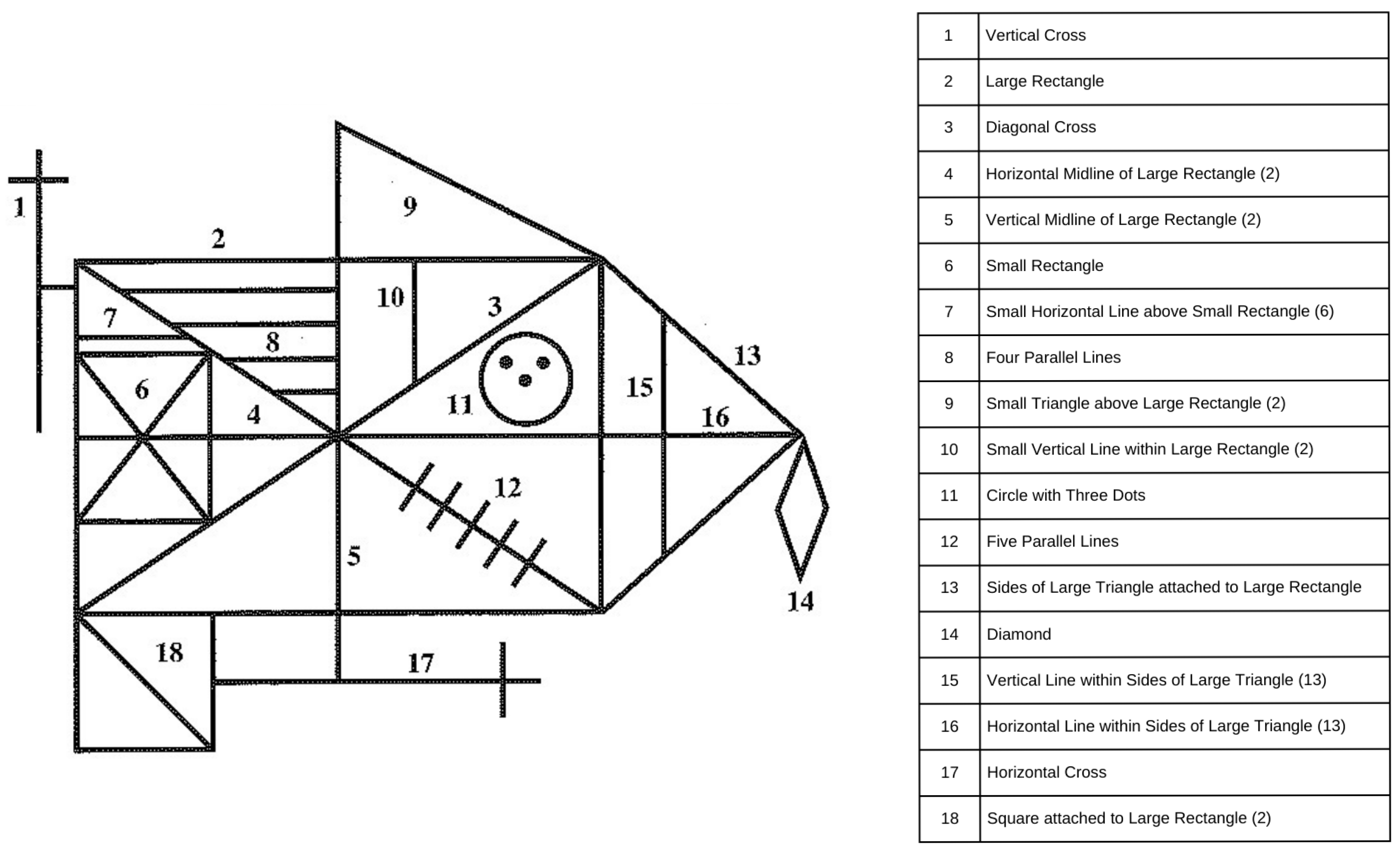 Rey Complex Figure (CF) scoring items. The left panel shows the Rey Complex Figure that participants reproduced during the copy, immediate recall, and delayed recall phases of the test. Each numbered element corresponds to a distinct structural component of the figure, summarized in the reference table on the right. The numbered labels are included to help readers identify component features and were not present on the version shown to participants.