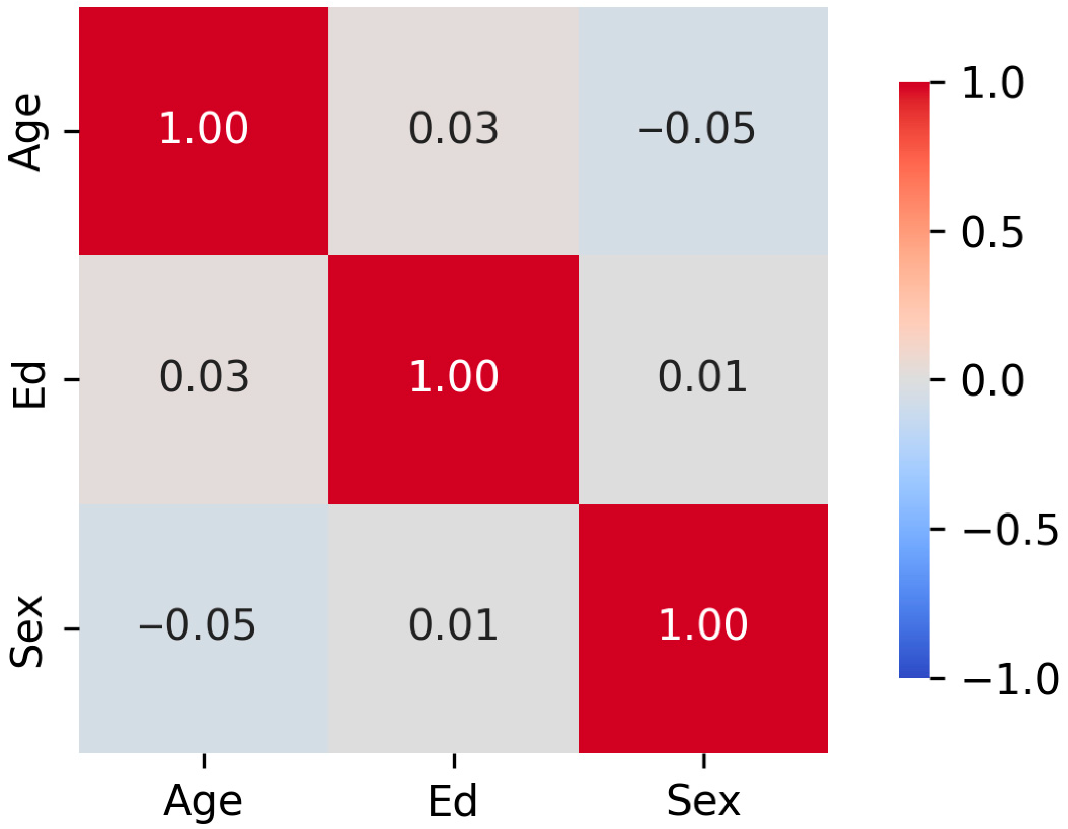 Correlation Matrix of Demographic Target Relationships. The correlation matrix shows near-zero associations: ρ (age, education) = 0.03, ρ (age, sex) = −0.05, and ρ (sex, education) = 0.01.