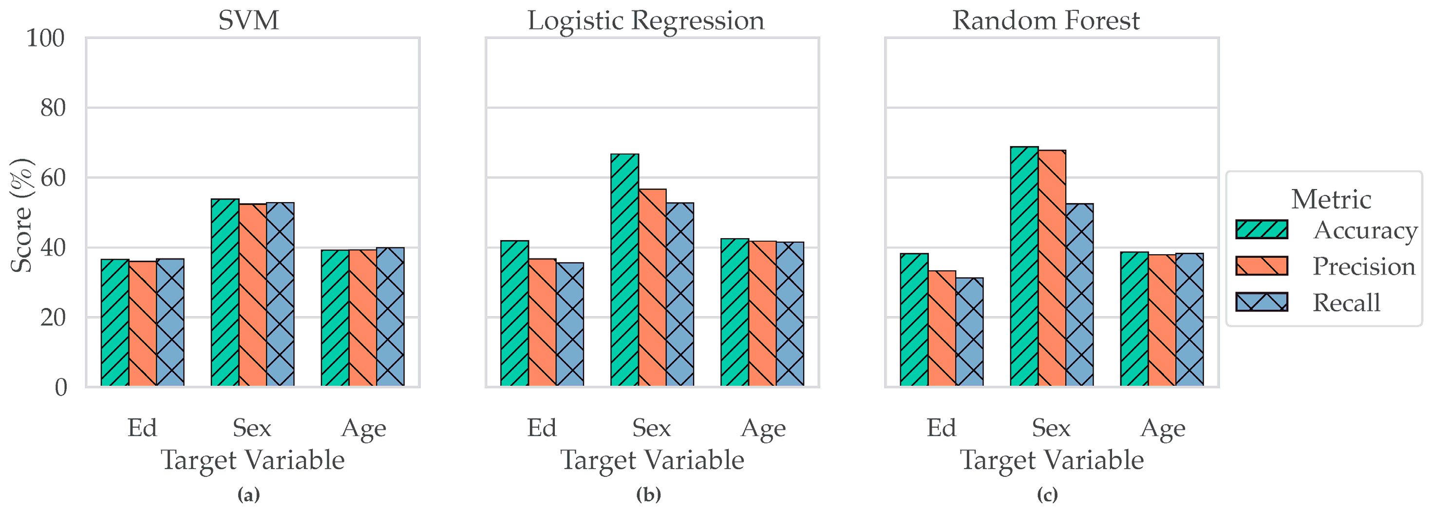 Classifier Performance by Target and Metric. Panels (a–c) show the performance of three classifiers—SVM (a), Logistic Regression (b), and Random Forest (c)—in predicting demographic targets. Each panel displays classifier performance across Accuracy, Precision, and Recall for three target variables: Education (Ed), Sex, and Age. Logistic Regression (b) achieved the highest accuracy for predicting both Education and Age, while Random Forest (c) outperformed other classifiers in predicting Sex, showing both the highest accuracy and a marked increase in precision.