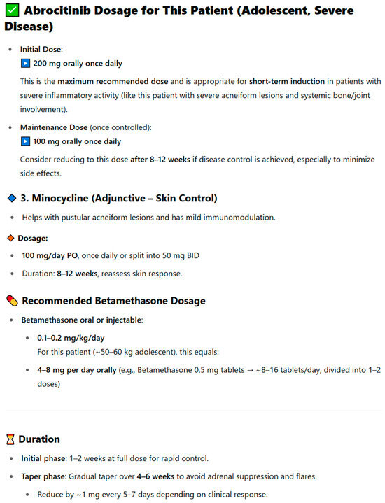 - Lin, Z.; Piao, S.; Zhang, R.; Yu, C.; Hou, Z.; Wang, A. Successful treatment of SAPHO syndrome with oral abrocitinib: A case report. J. Dermatol. Treat. 2024, 35, 2437259. [Google Scholar] [CrossRef]