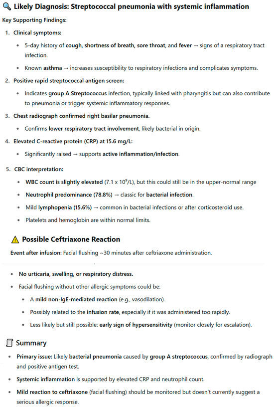 - A set of 20 descriptions with documented patient cases that were successfully treated with pharmacotherapy [12,13,14,15,16,17,18,19,20,21,22,23,24,25,26,27,28,29,30,31]. The articles were selected in such a way as to include an unambiguous description of the applied treatment that led to the patient’s recovery. The following formula was used to search scientific articles on PubMed: (“case reports” [Publication Type] OR “case study” [Title/Abstract]) AND (“pharmacotherapy” [MeSH Terms] OR “drug therapy” [MeSH Terms] OR “pharmacological treatment” [Title/Abstract]) AND (“successful treatment” [Title/Abstract] OR “recovery” [Title/Abstract] OR “cured” [Title/Abstract] OR “complete remission” [Title/Abstract]). The time range of the analyzed articles covers the years 2018–2025. The query intended for the AI models was accompanied by a description of the patient’s medical history taken from the publication.