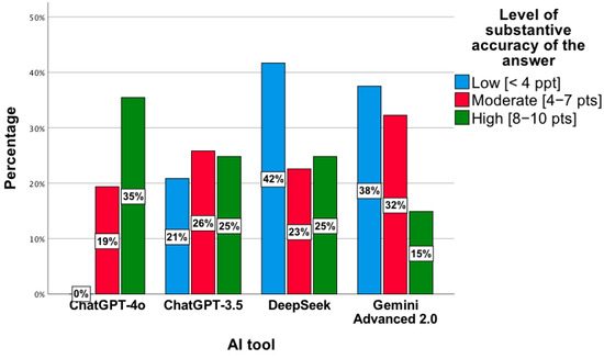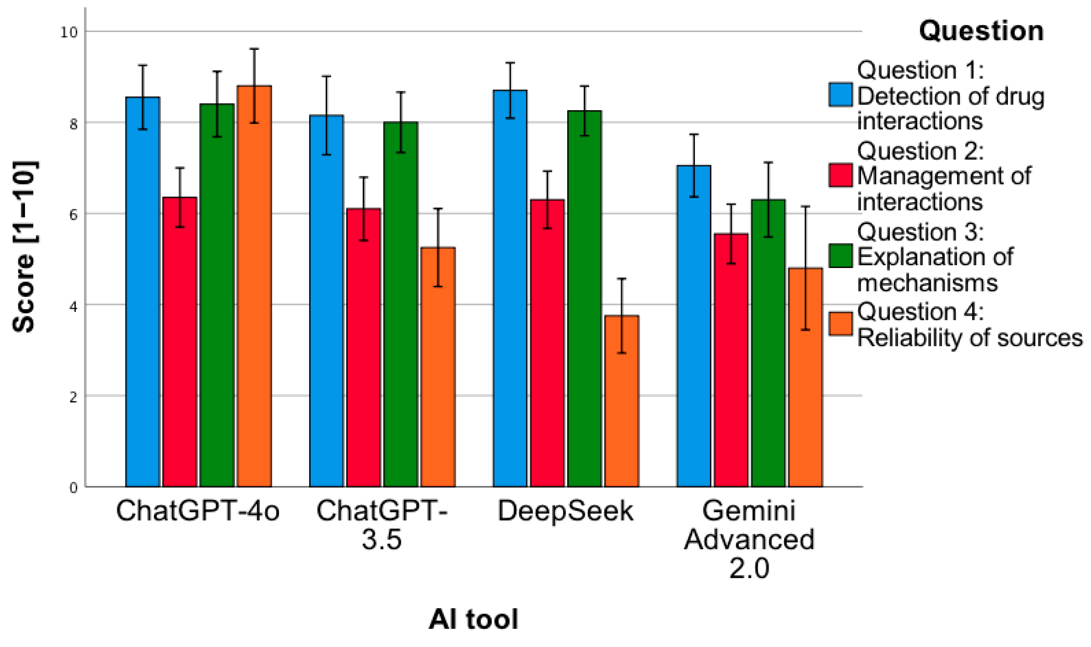 - The DeepSeek tool obtained a lower mean of correct answers for question 4 compared to each of the remaining questions (p < 0.001).