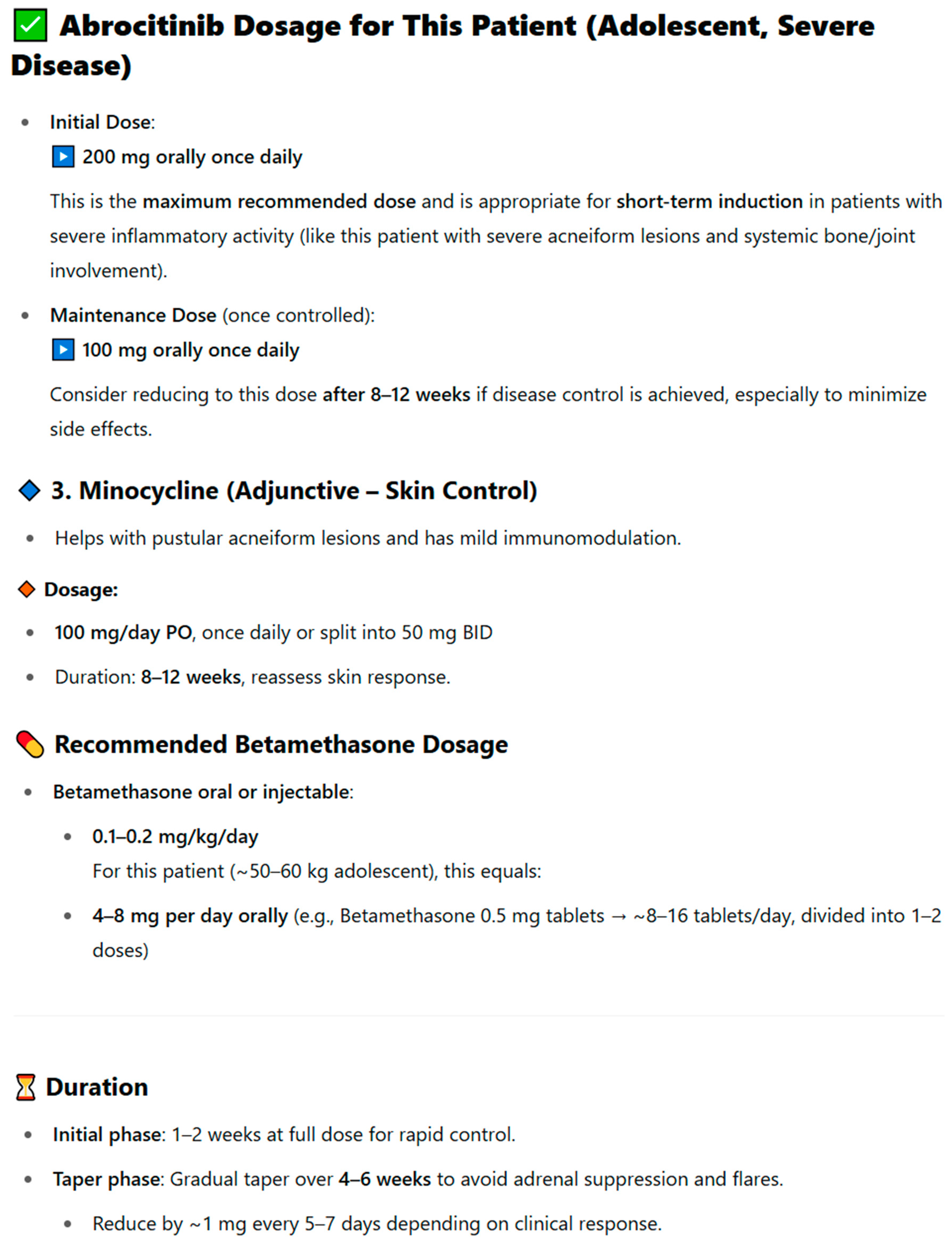- Question 7: “What therapy can be proposed for the patient, considering their medical history as presented in the following text? What is the recommended medication dosage and duration?”