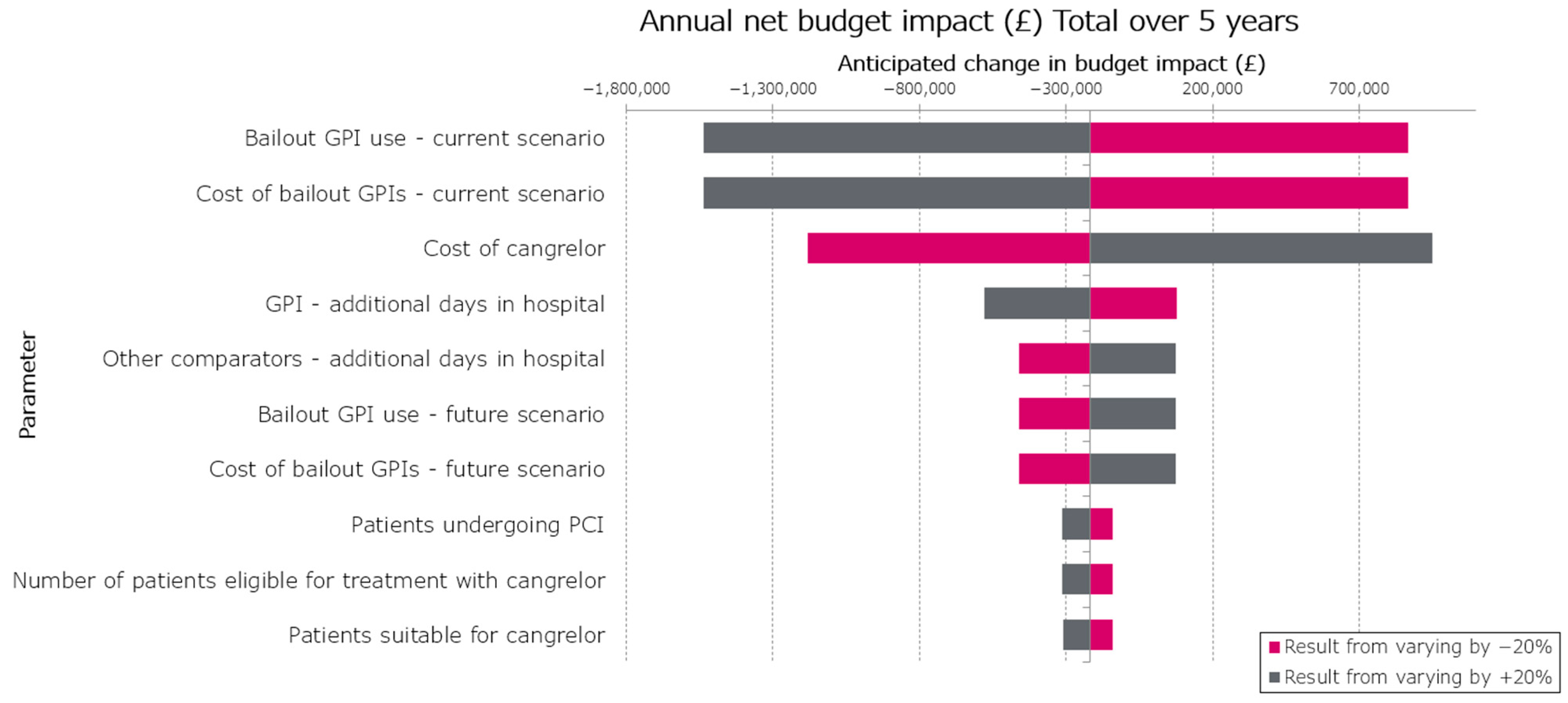 | Number of patients eligible for treatment with cangrelor | GBP 10,902.65 | GBP 7,055.62 | GBP 15,573.39 | −GBP 141,080 | −GBP 311,396 | GBP 170,316 |