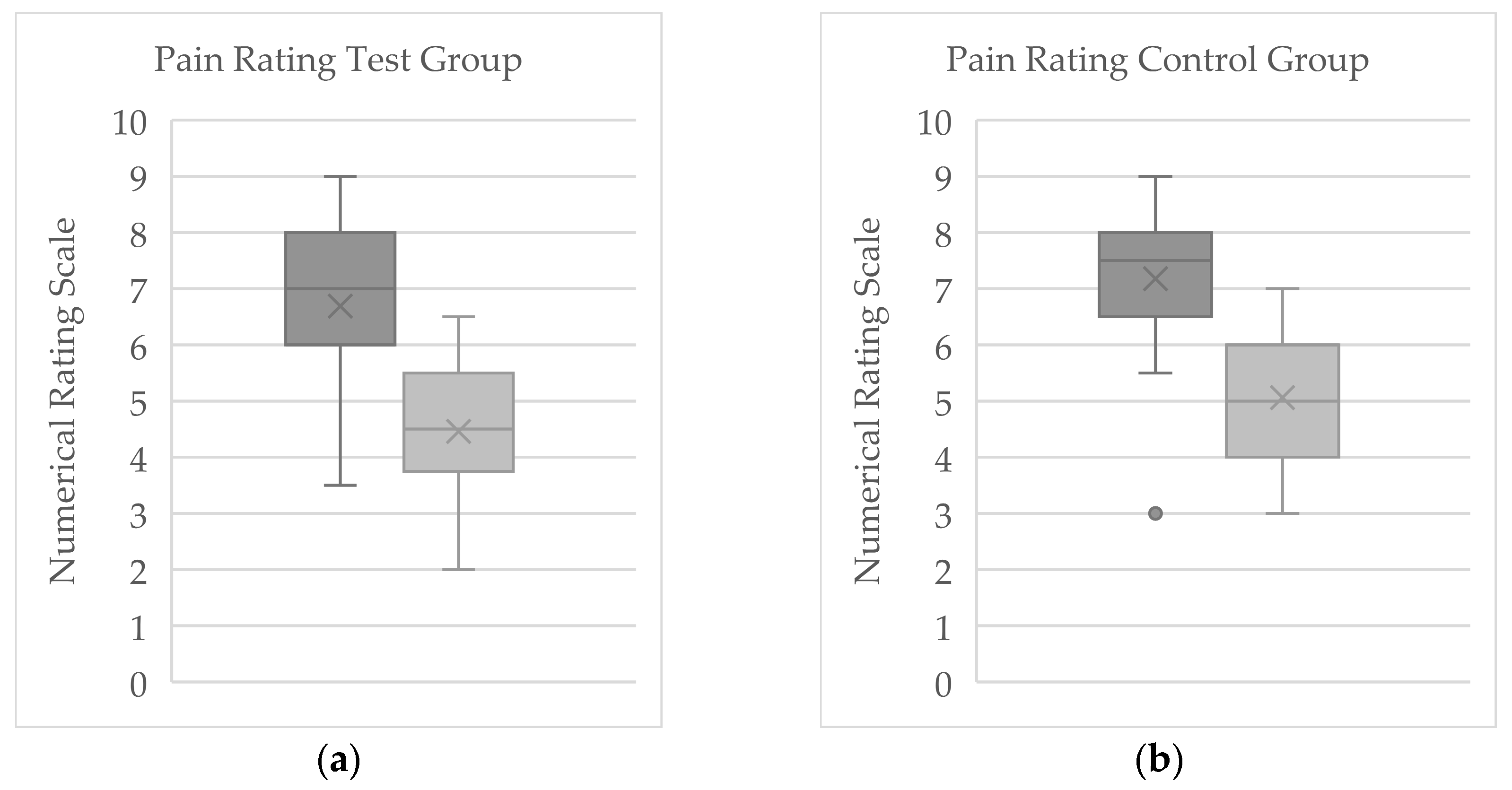 - Farrar, J.T.; Young, J.P.B.; Lamoreaux, L.; Werth, J.L.; Poole, R.M. Clinical Importance of Changes in Chronic Pain Intensity Measured on an 11-Point Numerical Pain Rating Scale. Pain 2001, 94, 149–158. [Google Scholar] [CrossRef] [PubMed]