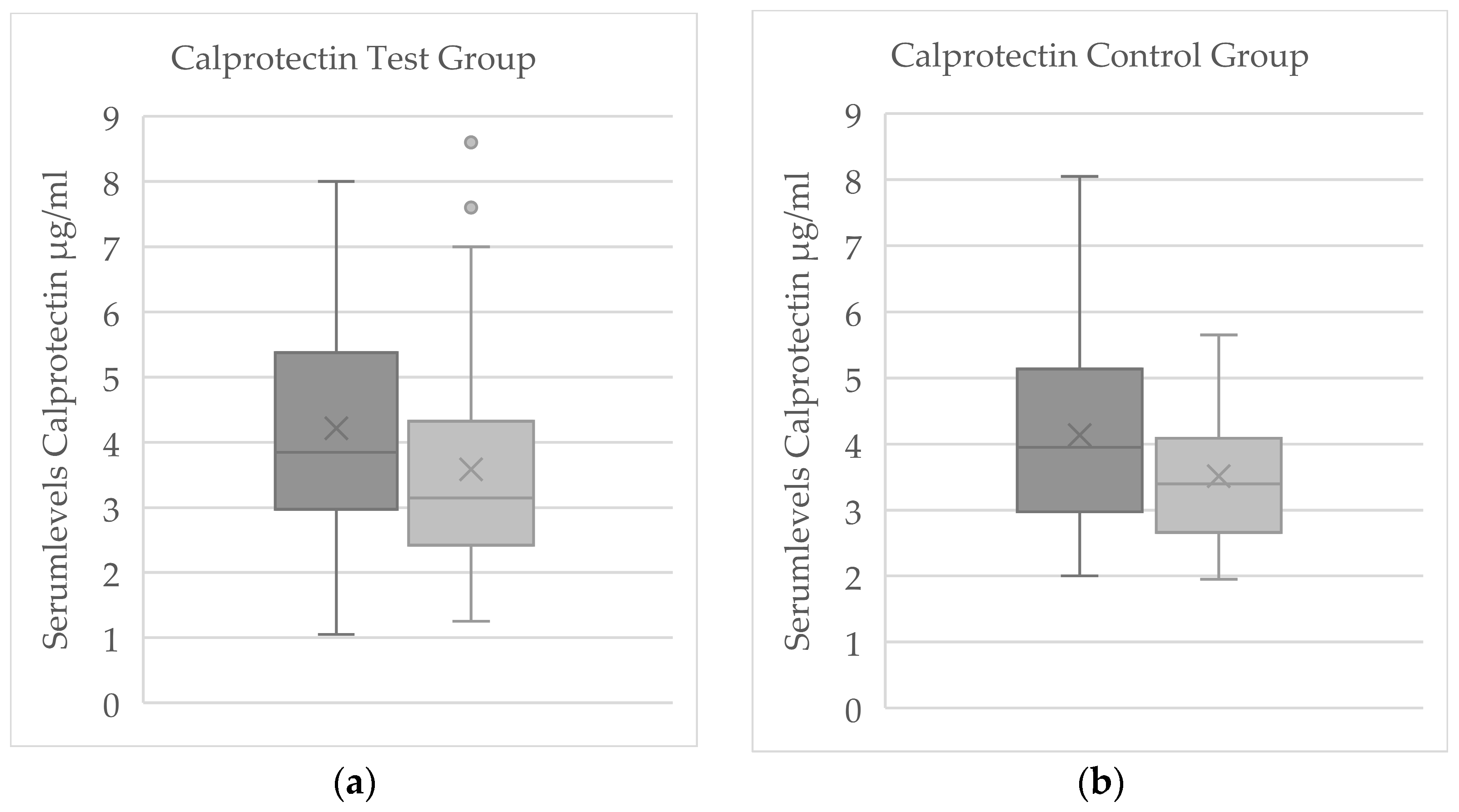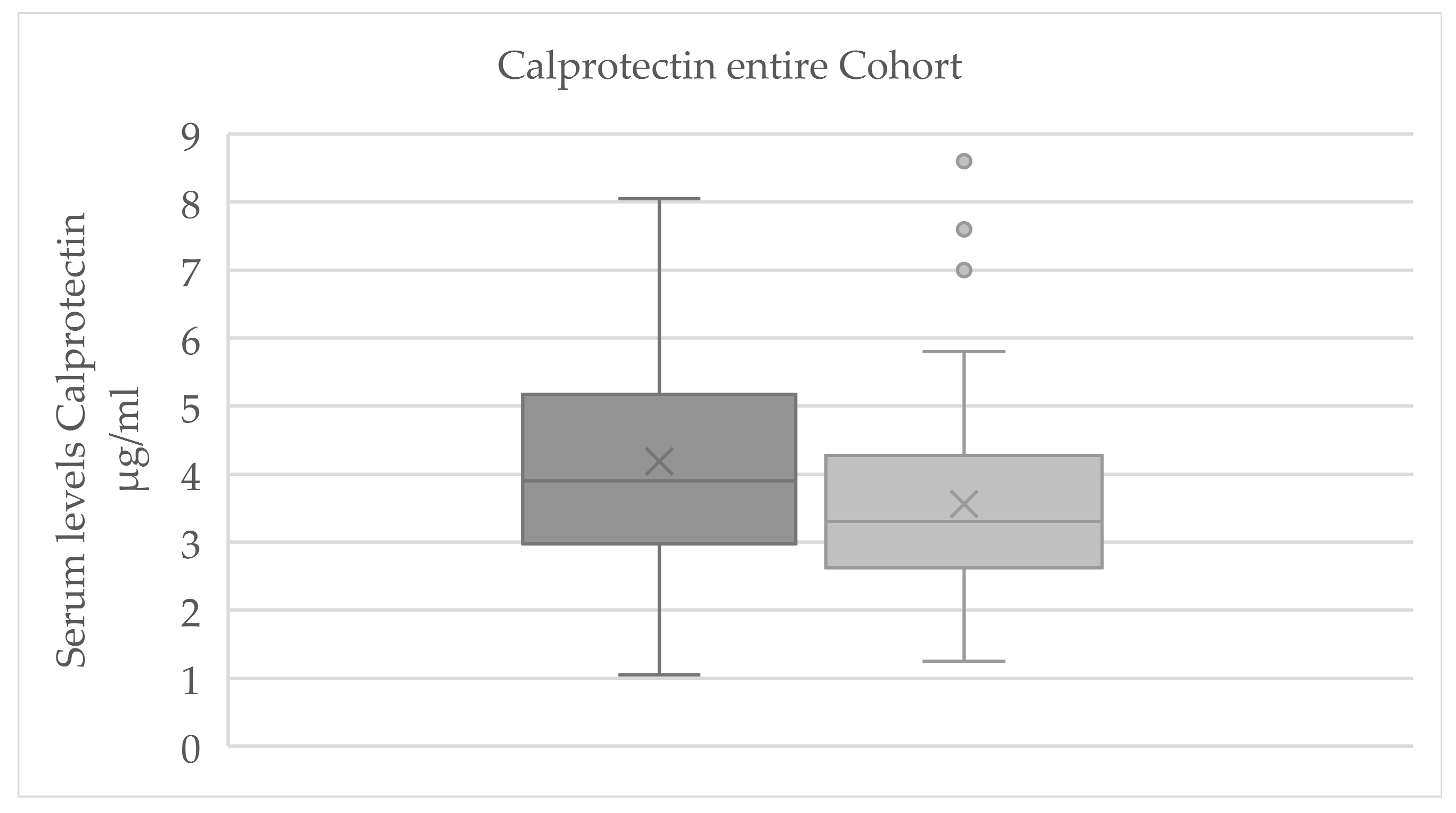 - Diehl-Wiesenecker, E.; Galtung, N.; Dickescheid, J.; Prpic, M.; Somasundaram, R.; Kappert, K.; Bauer, W. Blood Calprotectin as a Biomarker for Infection and Sepsis—The Prospective CASCADE Trial. BMC Infect. Dis. 2024, 24, 496. [Google Scholar] [CrossRef]
