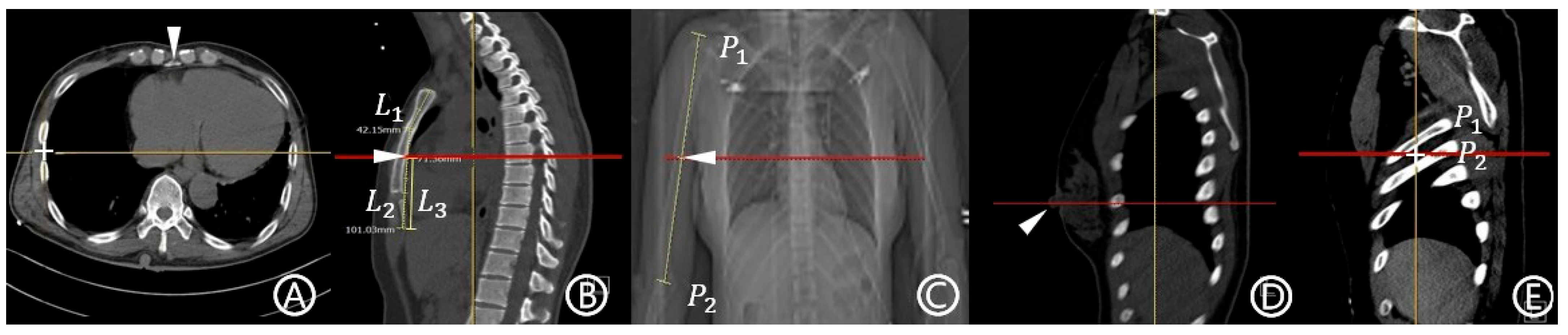 - Jang, J.; Woo, J.-H.; Lee, M.; Choi, W.S.; Lim, Y.S.; Cho, J.S.; Jang, J.H.; Choi, J.Y.; Hyun, S.Y. Radiologic assessment of the optimal point for tube thoracostomy using the sternum as a landmark: A computed tomography-based analysis. J. Trauma. Inj. 2024, 37, 37–47. [Google Scholar] [CrossRef] [PubMed]