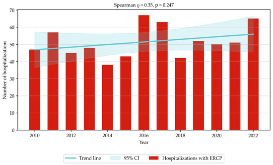 Statistical analysis was conducted in the Python 3.13.2 environment using the numpy, matplotlib.pyplot, pandas, and scipy.stats libraries. The total number of hospitalizations and the number of hospitalizations with ERCP performed were tested for normality of distribution using Shapiro–Wilk test. As both distributions were not normal (with p value of 0.168 and 0.458, respectively), Spearman’s correlation test was performed to assess presence of yearly trends.