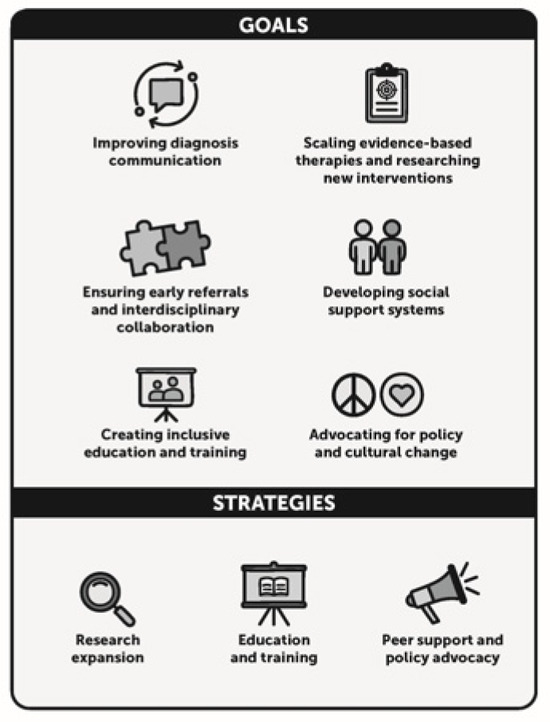 Education and training: The first strategy emphasizes education and training to enhance professional competencies, improve diagnosis communication with empathy and clarity, and ensure early referrals through interdisciplinary collaboration. Evidence-based guidelines already exist, including guidelines for early detection [3] and the SPIKES protocol [27] for delivering CP diagnoses to families compassionately. However, the recent literature highlights a persistent need to integrate training into academic programs and continuing education for clinicians [28,29,30,31]. Organizations such as the American Academy of Cerebral Palsy and Developmental Medicine [32], Cerebral Palsy Foundation [33], Cerebral Palsy Research Network [34], and Cerebral Palsy Alliance Research Foundation [35] actively supporting educational efforts. Utilization of low-cost multidisciplinary training models and knowledge translation strategies to promote guideline implementation has shown positive outcomes [36,37] and significant work is underway globally to implement early detection guidelines [16,38,39,40,41,42,43]. However, significant gaps remain in translating these efforts into widespread practice.