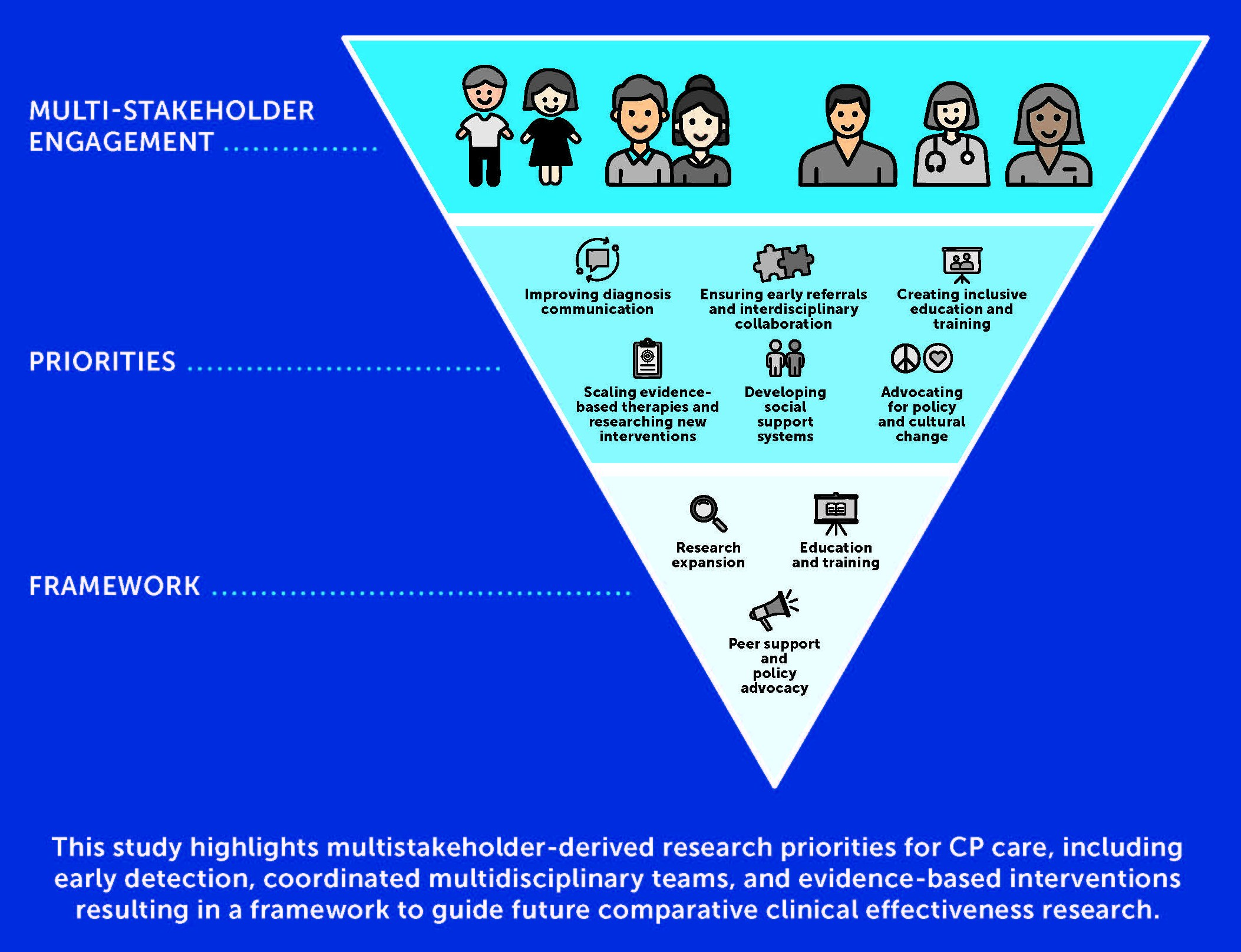 The findings from this project underscore the need for an integrated, multifaceted approach to addressing the complex needs of children with CP. The framework developed can serve as a guide for future research initiatives, clinical practice improvements, and policy development. By aligning research efforts with the identified priorities, multi-collaborators can work together to create a more inclusive and effective healthcare system for children with CP. Lay summary of findings are included in Supplementary Material S5.