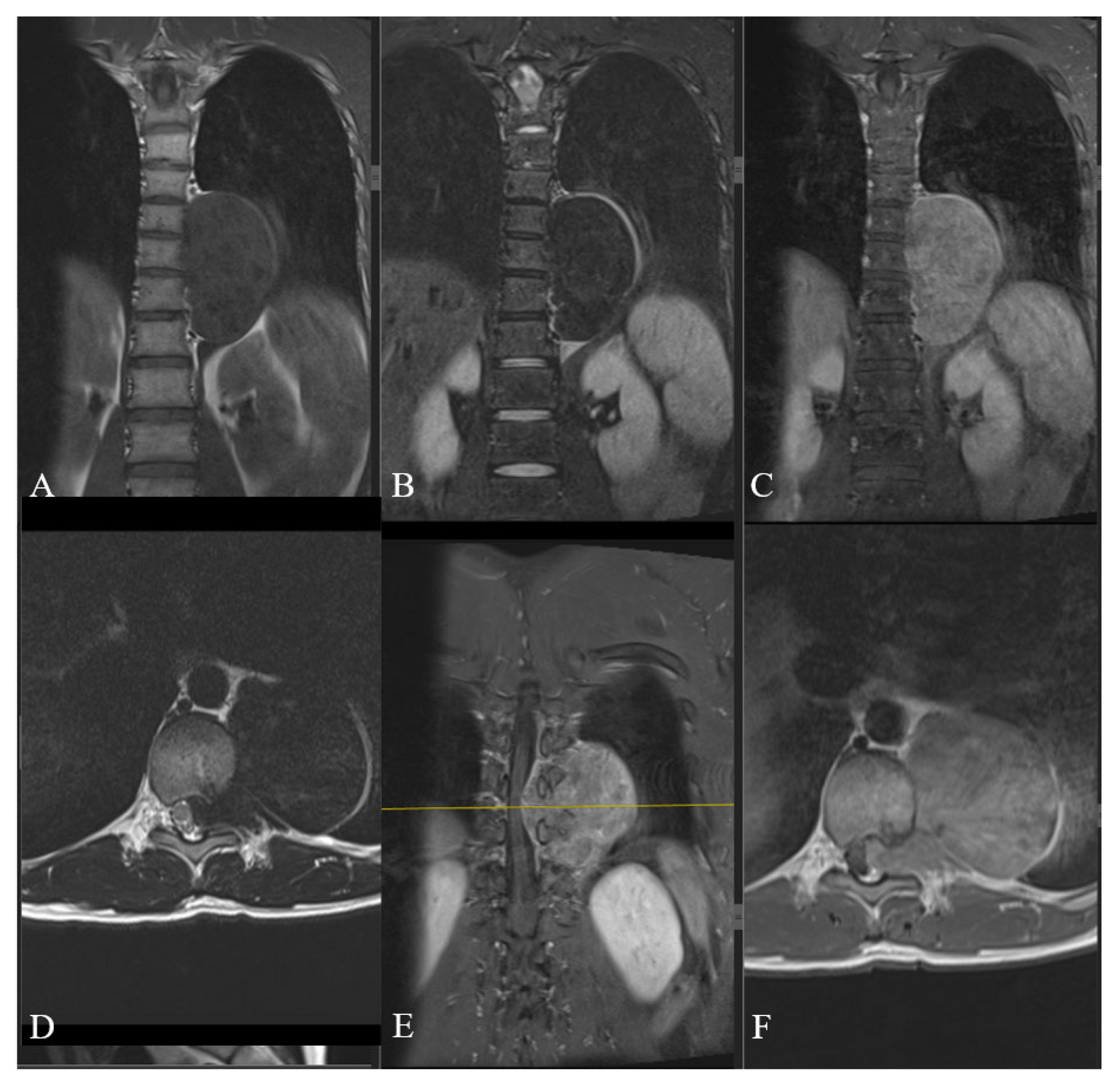 - Ko, S.F.; Ng, S.H.; Hsiao, C.C.; Hsieh, C.S.; Lin, J.W.; Huang, C.C.; Shih, T.Y. Juvenile fibromatosis of the posterior mediastinum with intraspinal extension. Am. J. Neuroradiol. 1996, 17, 522–524. [Google Scholar]