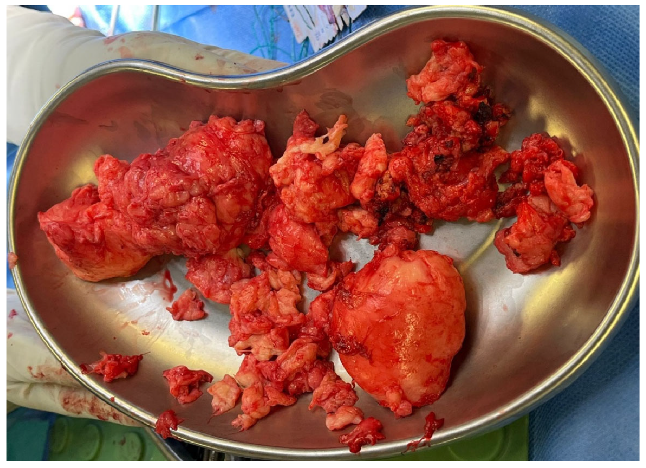 - Avinçsal, Ö.M.; Shinomiya, H.; Otsuki, N.; Sasaki, R.; Nibu, K.I. Successful management of aggressive fibromatosis of the neck: A case report. Balk. Med J. 2018, 35, 278–281. [Google Scholar] [CrossRef] [PubMed]