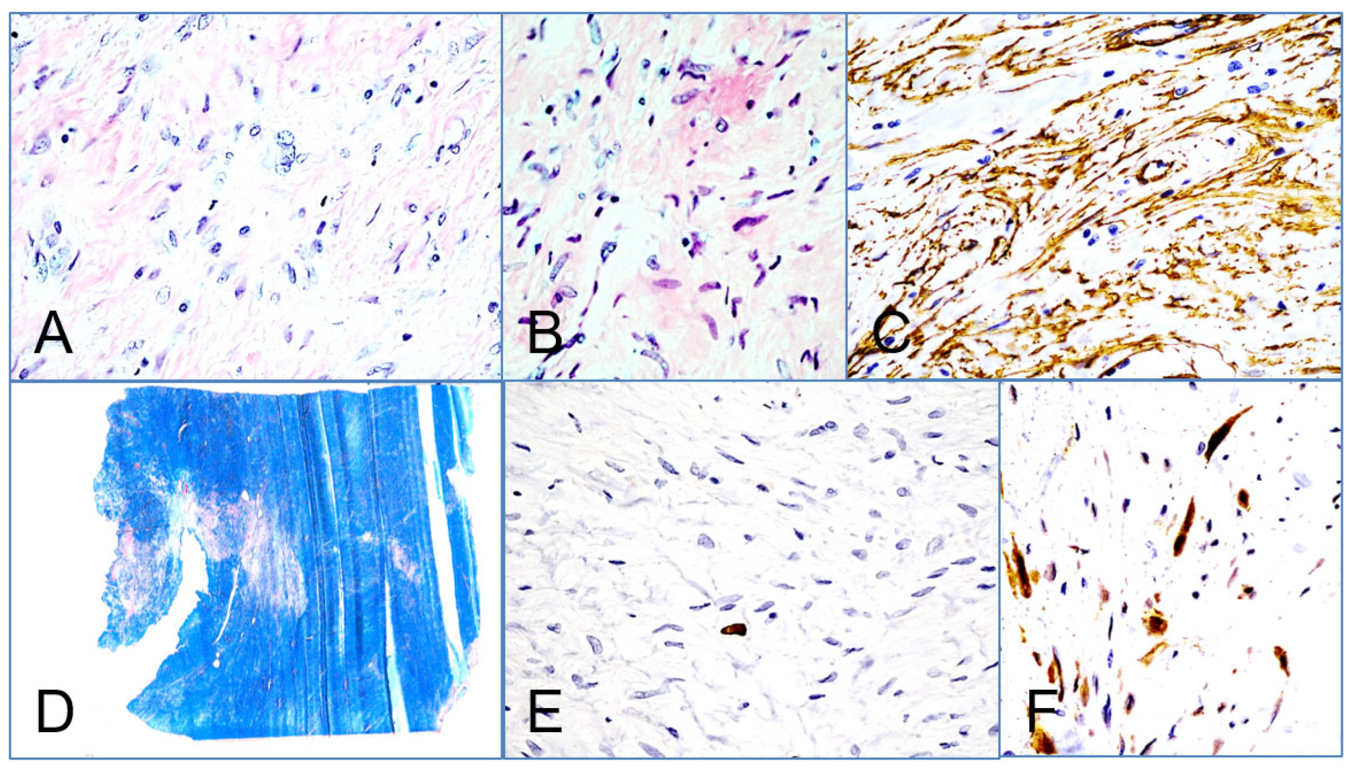 - Bernstein, K.E.; Lattes, R. Nodular (Pseudosarcomatous) fasciitis, a nonrecurrent lesion: Clinicopathologic study of 134 cases. Cancer 1982, 49, 1668–1678. [Google Scholar] [CrossRef]