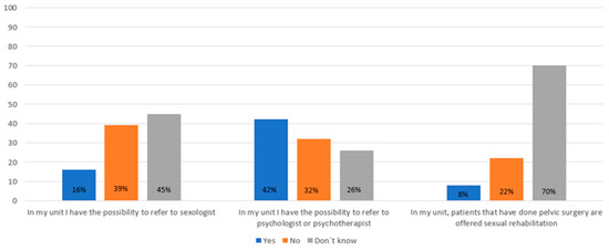 Overall, responses were consistent across professional groups; therefore, results are presented for the entire cohort. Half of the respondents indicated that they occasionally address issues related to relationships and sexuality with their patients, while 23% reported that they never discuss these topics (Figure 1). Similarly, 56% stated that patients occasionally initiate such conversations, whereas 19% said this never happens (Figure 1). Only 16% of respondents reported having access to a sexologist, while 42% could refer patients to a psychologist or psychotherapist (Figure 2). Only 8% of the healthcare providers reported that they offered sexual rehabilitation to patients following pelvic surgery.