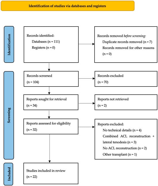 The structure of this review followed the recommendations for systematic literature reviews [29,30]. The objectives, analysis methods and inclusion criteria followed the PRISMA (Preferred Reporting Items for Systematic reviews and Meta-Analysis) recommendations (more details in Supplementary Materials) and were determined prior to data collection. Between 1 April 2024 and 26 April 2024, a bibliographic search was conducted on Medline, Embase, Scopus and Cochrane using the MeSH keywords “tenodesis”, “extra-articular tenodesis” AND “iliotibial band”, “fascia lata” OR “Lemaire procedure”, “Lemaire tenodesis”, “modified Lemaire”.