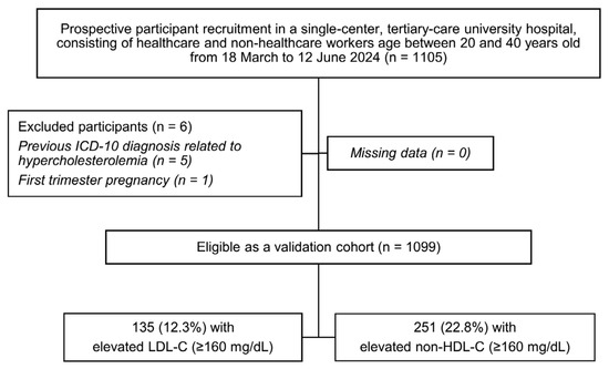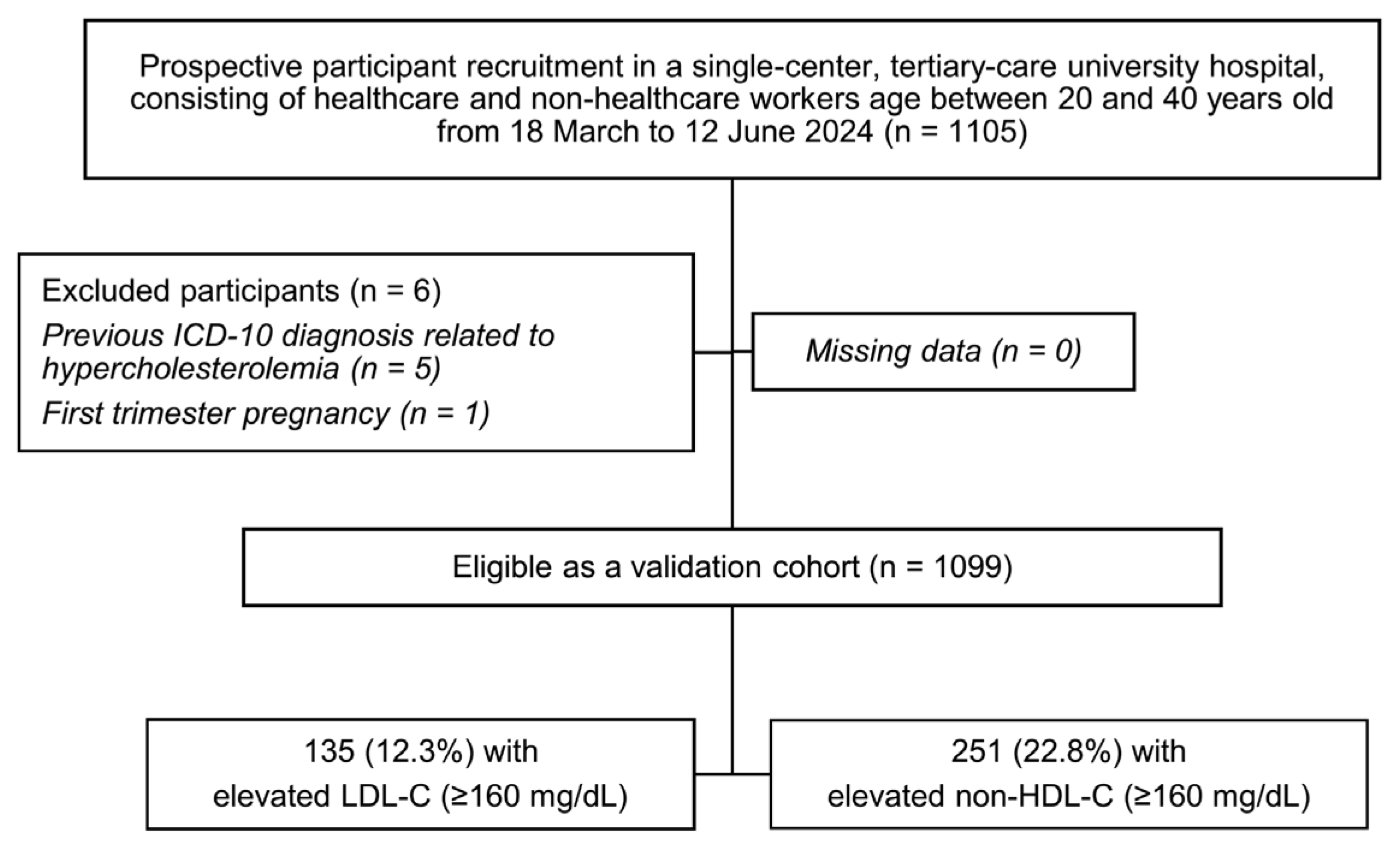 - Wuttipat, K.; Vithawat, S.; Wachiranun, S.; Phichayut, P. Diagnostic prediction model for screening of elevated low-density and non-high-density lipoproteins in young Thai adults between 20 and 40 years of age. BMJ Health Care Inform. 2025, 32, e101180. [Google Scholar] [CrossRef]