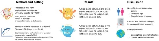 APA StyleKiratipaisarl, W., Surawattanasakul, V., Sirikul, W., & Phinyo, P. (2025). A Temporal Validation Study of Diagnostic Prediction Models for the Screening of Elevated Low-Density and Non-High-Density Lipoprotein Cholesterol. Journal of Clinical Medicine, 14(21), 7617. https://doi.org/10.3390/jcm14217617