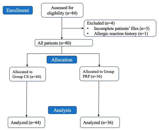 This retrospective cohort study aimed to evaluate the safety and efficacy of PRP in wound healing in children undergoing circumcision. The study population included 80 male children aged 6–18 years who underwent circumcision at Istanbul Esenyurt Necmi Kadioglu Hospital and Dicle University between 20 October 2023 and 28 February 2024. The patients were divided into two groups: Group CS consisted of children who underwent circumcision alone, while Group PRP included children who received an intraoperative PRP injection at the surgical site during the circumcision procedure. The patient selection flow chart is given in Figure 1.