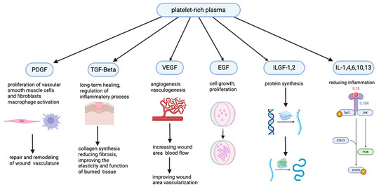 PRP is rich in coagulation factors, growth factors (PDGF, TGF-β1, IGF-1, VEGF, and FGF-2), and interleukins (IL-1, IL-4, IL-6, IL-10, and IL-13), which collectively promote tissue repair by stimulating cell proliferation, decreasing cytokine release, and reducing cell apoptosis [9,10,11,12]. These factors also attract stem cells, restore metabolic activity, and mitigate oxidative stress, further enhancing wound healing [10,11]. Additionally, PRP’s biological mechanisms include anti-inflammatory effects, such as promoting monocyte differentiation into anti-inflammatory phenotypes, reducing pro-inflammatory M1 macrophages, and activating dendritic cells. This combination of processes underscores the therapeutic potential of PRP in clinical practice, effectively reducing tissue necrosis and accelerating recovery [9,10,11,12] (Figure 4).
