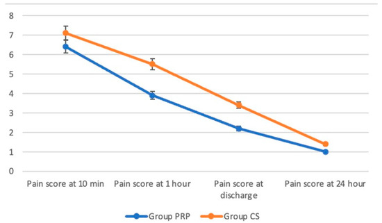 Figure 5 illustrates the Visual Analogue Scale (VAS) pain scores at various time points (10 min, 1 h, discharge, and 24 h) for Group PRP and Group CS. Group PRP consistently reported lower pain scores than Group CS at all time points (Figure 5).