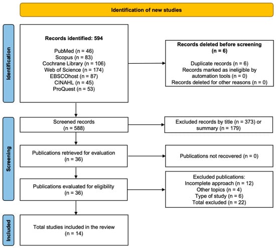 The database search yielded 594 studies in total, identified from PubMed, ProQuest, Scopus, Web of Science, Cochrane Library, and EBSCOhost CINAHL. Following the exclusion of six duplicates, 588 studies remained for the screening process. Of these, 552 were excluded based on title and abstract review for not meeting the eligibility criteria, leaving 36 articles for full-text assessment. Following a thorough evaluation, 22 articles were excluded for the following reasons: 12 lacked a complete focus on the topic, 4 addressed unrelated subjects, and 6 did not meet the required study design criteria. Ultimately, 14 studies were retained for inclusion in the review [16,37,38,39,40,41,42,43,44,45,46,47,48,49], providing evidence on the efficacy of interventions to improve gross motor abilities and support independence in ADLs for children with CP. The selection pathway is presented in Figure 1.
