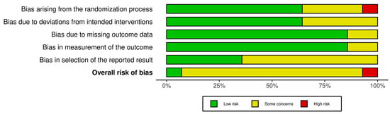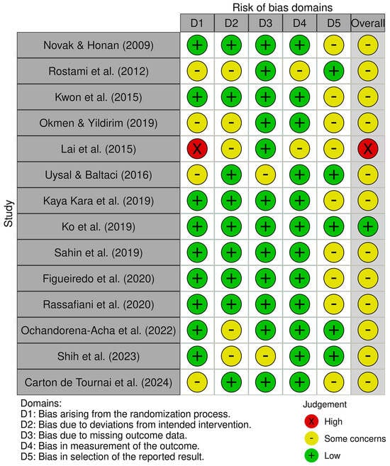 - Higgins, J.P.T.; Savović, J.; Page, M.J.; Elbers, R.G.; Sterne, J.A.C. Chapter 8: Assessing risk of bias in a randomized trial. In Cochrane Handbook for Systematic Reviews of Interventions, Version 6.4; Higgins, J.P.T., Thomas, J., Chandler, J., Cumpston, M., Li, T., Page, M.J., Welch, V.A., Eds.; John Wiley & Sons: Hoboken, NJ, USA, 2023. [Google Scholar]