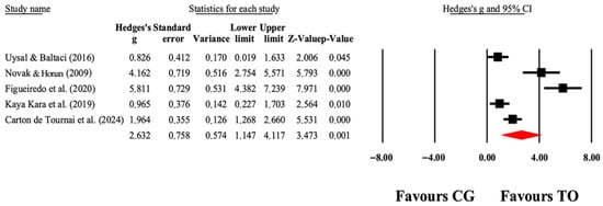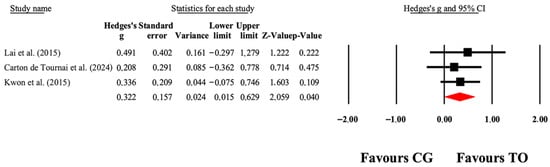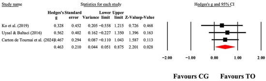 The forest plot illustrates the changes in GMFM-66 scores among patients with cerebral palsy who participated in occupational therapy compared to those assigned as controls. The values presented represent effect sizes (Hedges’ g) along with 95% CI. The size of the squares in the plot indicates the statistical weight of each study [38,40,49].