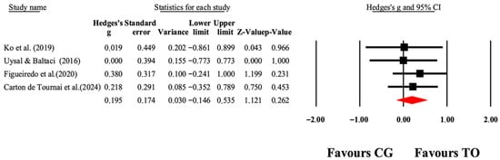 The forest plot illustrates the changes in PEDI-Self-Care scores among patients with cerebral palsy participating in occupational therapy compared to those assigned as controls. The values presented represent effect sizes (Hedges’ g) along with 95% CI. The size of the squares in the plot indicates the statistical weight of each study [41,42,45,49].