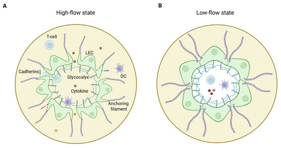 Architecture of initial lymphatics. (A) In high flow state, increased interstitial pressure opens flap valves, facilitating efficient fluid, (immune) cell, and protein entry and maintaining tissue fluid balance. The glycocalyx, a carbohydrate-rich layer, aids in mechanosensing and maintaining endothelial integrity. (B) In low flow state, reduced interstitial pressure closes flap valves, preventing retrograde flow and ensuring lymphatic vessel integrity. The glycocalyx contributes to regulating permeability and protecting endothelial cells. LEC = lymphatic endothelial cell; DC = dendritic cell.