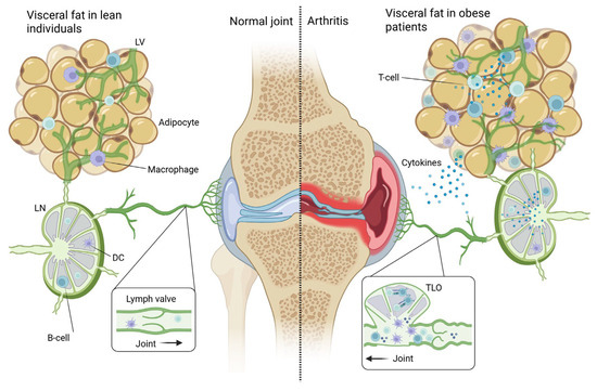 In addition to the general and local pro-inflammatory state associated with obesity, other localized mechanisms may contribute to arthritis susceptibility. Emerging evidence suggests that obesity creates both mechanical and metabolic obstruction of lymphatic drainage—the system responsible for clearing inflammatory mediators, immune complexes, and cellular debris from tissues, including synovial spaces [16]. Mechanically, excess adipose tissue can compress lymphatic vessels, while metabolically, hyperinsulinemia and lipotoxicity impair the contractile function and endothelial barrier integrity, compromising drainage function.