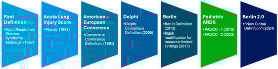 Acute Respiratory Distress Syndrome (ARDS) is a life-threatening condition characterized by acute severe hypoxemic respiratory failure secondary to non-cardiogenic pulmonary edema, first described in 1967 by Ashbaugh et al. [1]. Since then, its clinical definition has undergone multiple revisions to improve diagnostic accuracy and standardization for both clinical care and research (Figure 1). The most widely adopted adult definition, the Berlin definition, was established in 2012 [2,3], but its limitations [4]—particularly in resource-limited settings lacking chest radiography, arterial blood gas analysis, or mechanical ventilation—led to adaptations such as the Kigali modification [5].